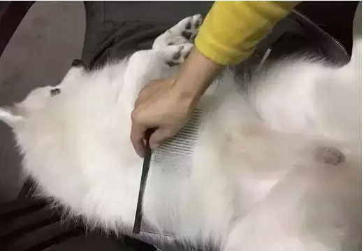 6. 如果狗狗毛發(fā)較厚,梳子難以梳透,可以一層一層分開梳理,先梳理被毛,梳順之后掀開再梳理底絨,最后再統(tǒng)一梳理。