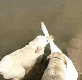 還有前段時間一只大白鵝要下水玩,兩只熊狗子就死活拖著人家往岸上走,生怕把這大兄弟給掩嘍~